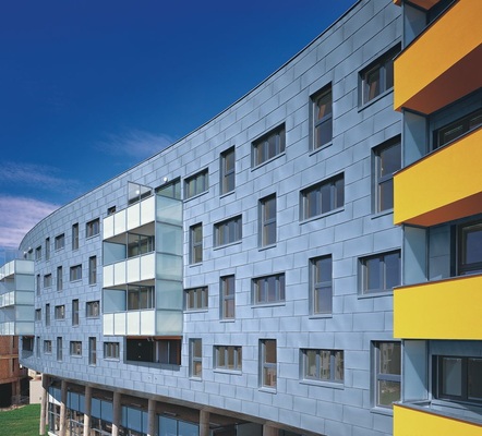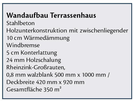 Zurecht spricht das Architektenduo Christian Mascha und Christian Seethaler begeistert von einem Planungsprozess, der völlig anders als üblich ablief. Die Zusammenarbeit zwischen Architekten, Beamten und Anrainern sowie die gemeinsam erarbeiteten Rahmenbedingungen bildeten die Basis für die Planungsarbeit am Terrassenhaus. Es zeigt sich als ein, durch sattes Gelb und elegantes Silbergrau geprägtes Gebäude mit zwei Gesichtern. Während sich die Nord-Fassade als städtische Kante mit graphisch wirkendem vorgesetztem Schirm aus Beton präsentiert, weitet sich unter dem Überhang des Gebäudes eine regengeschützte Zone aus. Die auf der Südseite untergebrachten Privaträume gehen fliesend in einen als Dschungel gestalteten Naturraum über. In die schräg verlaufende Süd-Fassade sind nicht einsehbare Loggien eingeschnitten. Hier wohnende meist junge Familien profitieren von Balkonen mit Blick zum Himmel, der verkehrsfreien Zone und der üppigen Vegetation direkt vor dem Haus. Die geneigte Süd-Fassade ist ständig der Witterung ausgesetzt, sodass Regenwasser an ihr abgeleitet wird. Die Wahl der Fassadenbekleidung und auch die technisch richtige Ausführung sind daher existenziell für ein gutes Wohnklima und den dauerhaften Schutz vor Feuchtigkeit. Die jahrzehntelange Erfahrung bestätigt, dass titanzinkbekleidete Gebäude ohne weitere Beachtung, Überprüfung oder Wartung geschützt sind. Auch am Terrassenhaus begünstigen diese wesentlichen Aspekte die Werterhaltung sowie die Berechnung langfristiger Unterhaltungskosten. Die aus Rheinzink-Großrauten hergestellte Fassade erfüllt diese Schutzfunktion perfekt. Zudem erkennt man auf der walzblanken Zinkoberfläche den Tageslauf als Licht- und Schattenspiel, was dem Gebäude eine natürliche Lebendigkeit verleiht. Architekt Seethaler sieht das Terrassenhaus als zeitloses Objekt, das seinen Idealzustand beibehalten und gleichzeitig den Wert für den Eigentümer erhöhen wird und sagt: „Oft werden schöne Häuser durch ihre geschleckten Fassaden verschandelt. Das Material Rheinzink ist sympathisch, da man damit Handarbeit, Leben und Texturen sieht.“ Materialwahl sowie die handwerkliche Verarbeitung sind daher nicht nur ein ästhetisches, sondern auch ein wesentliches ökonomisches Kriterium und die vom Rheinzink-Qualitäts-Spenglerbetrieb** Karl Hudribusch GesmbH aus Perchtoldsdorf sehr sorgfältig ausgeführte Titanzink-Fassade ein lebendiger gebäudeschützender Bestandteil.