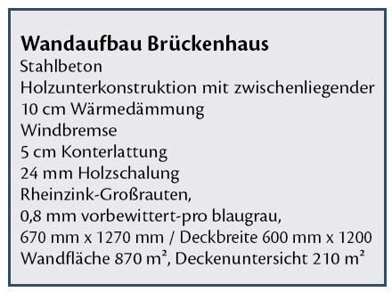 An der Kabelwerk-Westseite definiert ein um drei Stockwerkshöhen angehobener, leicht geschwungener Baukörper den zentral gelegenen Otto-Bondy-Platz. Brückenartig überspannt das dynamische Gebäude tieferliegende Bereiche und verknüpft nahezu fließend unterschiedlichste Raumsituationen. Ein Lokal im darunterliegenden gläsernen Pavillon lädt zum Verweilen ein und eröffnet dem Gast spannende Perspektiven. Fast scheint es, als verbände das Brückenhaus umliegende „Wohnblock-ufer“ miteinander. Zwei an den „Uferbereichen“ stehende, großzügig verglaste Treppenhäuser erinnern dabei an Brückenpfeiler. Bei der Wahl der Baustoffe wurde großer Wert auf die Prinzipien der Bauökologie und Schadstoffvermeidung gelegt. Per Gebäudepass sind diese Eigenschaften auch für die als umweltverträgliches Bauprodukt zertifizierte Rheinzink-Fassade beurkundet. Darüber hinaus zeigt die prägnante Struktur der werkseitig vorpatinierten Rheinzink-Großrauten mit der Oberfläche „vorbewittert-pro blaugrau“ von Beginn an die typische Patina. Es sind die charakteristischen Eigenschaften handwerklich hergestellter Titanzink-Fassaden, die Architekt Hermann so sehr schätzt: „Die Fassaden besitzen eine Lebendigkeit, die im Laufe der Jahre noch schöner wird“. Daher ist es dem titanzinkverliebten Architekten ein Anliegen, das Team des Spenglerfachbetriebes Karl Hudribusch GesmbH öffentlich zu loben und dessen präzise handwerkliche Arbeit und organisatorische Abwicklung zu erwähnen.