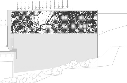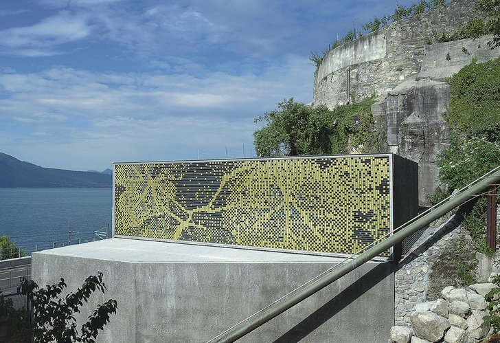 Im Innenbereich filtert die Fassade das Licht und erzeugt so wechselhafte Schattenbilder, die den weit geöffneten Raum für die Weinverkostung beleben. In der Nacht scheint die Raumbeleuchtung durch die Fassade, die dann als großformatige Werbefläche dient. Die „Tecu Gold“-Tafeln wurden aufgrund ihres besonderen Farbtons und der einzigartigen lichtreflektierenden Eigenschaften eingesetzt. Die Kacheln wurden auf leichte Stahlrahmen montiert, die direkt in der Betonstruktur verankert sind. Die raffinierte Gestaltung von Fassade und Sichtraster zeigt eine enge Verbundenheit mit dem Ort sowie die moderne Interpretation historisch zusammenhängender Gegebenheiten. Das Raster aus Kupfer und Glas, aus einem gewissen Abstand als figuratives Bild von Reben und Blättern wahrgenommen, schafft eine intensive Verbindung zur Landschaft und zum Zweck des Projektes. Im Inneren dient der Sichtschirm als malerischer, abstrakter Lichtfilter. Das Projekt behandelt den Werkstoff äußerst sorgsam für eine subtile Lichtnutzung.