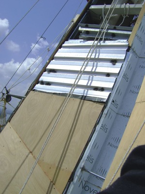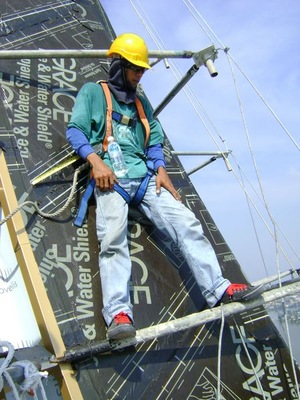 Nachdem alle 36 Dachseiten in Doppelstehfalztechnik bedeckt waren folgte die Installation der Flachfalz-Elemente. Hier machte sich die Höhe noch stärker bemerkbar als es schon im „unteren“ Bereich des Daches der Fall war. Daher entschied ich, dass es einfacher wäre, die Boxen auszuladen und die einzelnen Scharen mit Haken zu sichern. So befestigten wir die Flachfalzscharen an Rohrgestellen, welche aus Sicherungs- und Fortbewegungsgründen installiert worden waren. Dies erwies sich als eine äußerst effektive und einfache Lösung, sorgte für kurze Transportwege und konnte mit nur zwei bis drei Mann erledigt werden. Unser ehrgeiziges Ziel, das Dach des neue Parlamentsgebäudes bis zum malaiischen Nationalfeiertag am 31. August voller Stolz präsentieren zu können, rückte näher. Zur Steigerung der Montageleistung wurde die sieben Tage Woche mit acht bis zehn Stunden Arbeitszeit eingeführt. Auch „experimentierten“ die Philippiner mit teilweise absurden Ideen. Beispielsweise wurden die Hafte nur mit einer Schraube befestigt und vorgegebene 25-cm-Haft-Abstände willkürlich erhöht. Auf meine Frage warum eine Schraube genüge bekam ich zu hören: „Aluminium not heavy, one screw enough“ (Aluminium nicht schwer, eine Schraube genug).