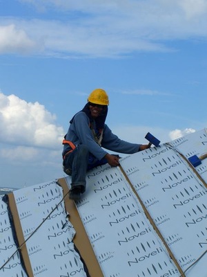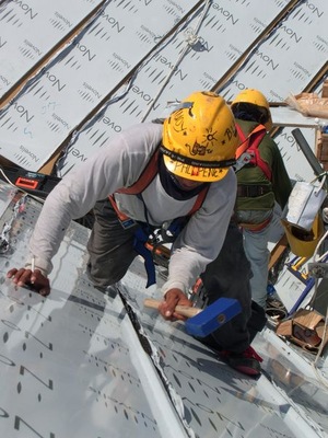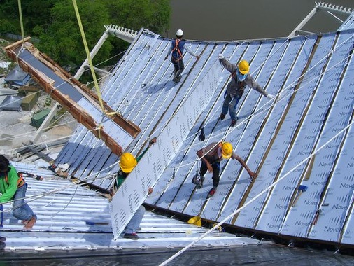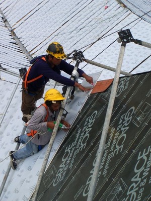 Durch die Form des Daches waren Materiallagerung und Montage überaus anspruchsvoll. Auch war das Begehen des Daches, bedingt durch die Dachschräge gefährlich und erforderte den ganztäg-igen Einsatz von Klettergurten. Einige Arbeiter versuchten barfuß zumindest etwas Halt zu finden