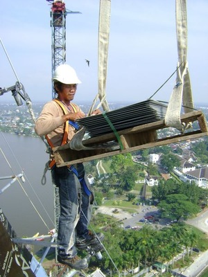 Bereits wenige Tage nach Abschluss der Meisterprüfung am 30. April 2008 befand ich mich auf dem Weg. Schon beim Landeanflug auf Kuching, der Hauptstadt des malaiischen Bundesstaates Sarawak auf Borneo, konnte ich die Größe des Gebäudes erahnen. Gleich am er-sten Tag lernte ich für das Projekt verantwortliche Personen kennen. Detailliert besprachen wir aktuelle Probleme und suchten nach entsprechen-den Lösungen. Darauf- hin verschaffte ich mir einen Eindruck vom Stand der Arbeiten am Gebäude. Am zweiten Tag konnte ich zusammen mit zwei einheimischen Ingenieuren das Gebäude von Nahem betrachten. Schließlich sollte ich von nun an mehrere Monate auf der Baustelle verbringen, also brannte ich geradezu darauf, meinen neuen Arbeitsplatz und die neuen Kollegen kennen zu lernen.