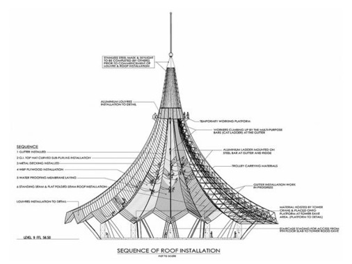 Das Montageteam bestand aus 13 philippinischen Arbeitern um deren Vorarbeiter „John“ sowie zwei aus Deutschland angereisten Spenglermeistern. Zwei weitere Arbeitskräfte waren ständig in der Produktion eingesetzt. Nach einigen Tagen der Akklimatisierung und des Kennenlernens sowie der Gewöhnung an den malaiischen Arbeitsrhythmus konnten wir mit der Installation der ersten Scharen beginnen. Durch die Höhe des Hauptturmes konnten die bis zu 7,50 m langen Scharen nur mit Hilfe eines der beiden Kräne transportiert werden. Die dazu eingesetzte Transportbox brachte esin beladenem Zustand auf stattliche 500 kg.Allein die sichere Lagerung der Aluminiumelemente war ein Akt. Bei über 35º Cwaren acht Mann nahezu drei Stunden damit beschäftigt, die Box auf dem Dach zu sichern. Auch die Montage ging nur sehr schleppend von der Hand. Zum einen, weil die Arbeiter zum ersten Mal in ihrem Leben außerhalb der Trainingsstunden ein Stehfalzdach installierten und somit die Arbeitsabläufe noch nicht eingespielt waren – zum anderen, weil es Kommunikationsprobleme gab. Schnell wurde uns klar, dass selbst wir, die aus Deutschland angereisten Fachleute, den Arbeitsablauf noch nicht vollkommen »