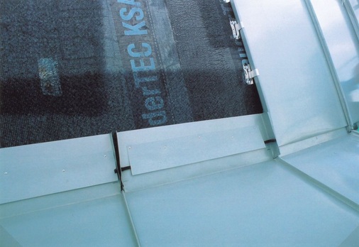 Die Dachentwässerung erfolgt – wie schon erwähnt – über kastenförmige Dachrinnen und runde Rheinzink-Regenfallrohre. Natürlich wurden für Abläufe, Innen- und Außenecken, Sammelkästen und Bewegungsausgleicher die passenden Fertigteile aus dem Rheinzink-Dachentwässerungsprogramm verwendet. Die gesamten Dachkanten im Bereich der außen umlaufenden Flachdachzonen erhielten obere Abdeckungen und vordere Sichtblenden, die indirekt auf der Unterkonstruktion befestigt wurden.