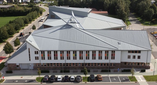Dreiecke, trapezförmige Dachflächen und vorbildliche Stehfalzarbeiten mit langen Scharen sind das Erkennungsmerkmal des multifunktionalen Kulturzentrums. Das mit einem 5000 m 2 großen Stehfalzdach aus zinkbeschichtetem Aluminium ausgestattete Bauwerk wurde auf dem früheren Bahnhofsgelände der 10000-Einwohner-Stadt errichtet. Es besticht durch den konsequenten Einsatz von Stehfalztechnik auf zahlreichen markant geformten Dachflächen. Hintergrund: Der Städtebaudienst in Lüttich sprach im Vorfeld ein generelles Bauverbot für Flachdächer am Triangel aus. Um den großen Saal mit seiner Fläche von 571 m 2 und der Höhe von 16 m dennoch ansprechend zu überdachen, entwarfen die Architekten eine weit nach unten reichende und fächerförmige Dachlandschaft. Dabei wurden einzelne Dachflächen größtenteils in Form unregelmäßiger Dreiecke angelegt.