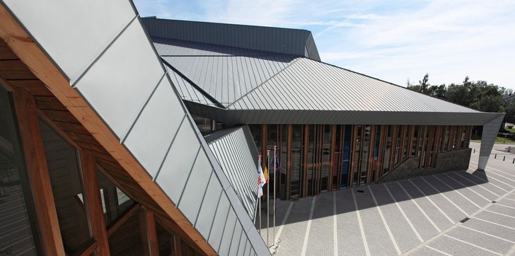 - Die unverwechselbare Architektur des Kulturzentrums ist an dreieckigen und trapezförmigen Flächen erkennbar.