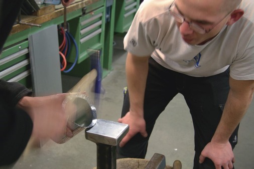 Nur zehn Minuten und eine knappe Begrüßung durch die RMS-Ausbilder Gert Brenner und Hans-Peter Rösch, später hält Oleg „seine“ erste Blechschere in Händen. Der erste Schnitt an der zuvor angezeichneten Stutzenabwicklung ist spannend. Schnell gewöhnt sich Oleg an das neue Werkzeug und an das Metall. Wenig später ist sein Stutzen gerundet, gefalzt und geschweift, wobei die fachmännische Anleitung das Erstlingswerk durchaus hochwertig erscheinen lässt.