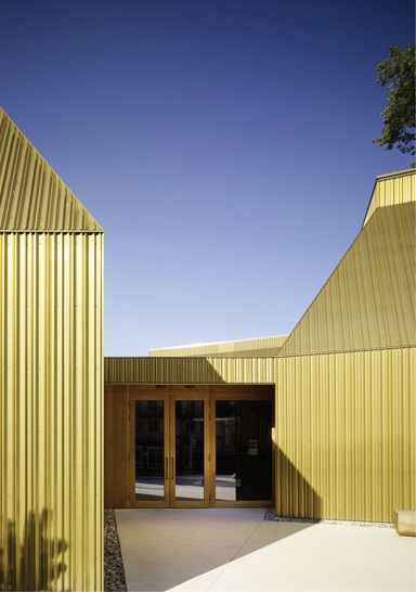 Mit den formalen Überlegungen einher ging von Anfang an die wesentliche Frage nach dem Material für die Gebäudehaut. Eine Rohrdeckung kam aus verschiedenen Gründen nicht in Frage, sollte aber so weit wie möglich in moderner Architektursprache adaptiert werden. Eine nachhaltige Kupferbekleidung, die von Natur aus vergleichbare Alterungseigenschaften aufweist, wurde von vornherein favorisiert. In Zusammenarbeit mit einem kompetenten Industriepartner für Architekturwerkstoffe aus Kupfer fiel die Wahl schließlich auf eine legierte Form aus dem Portfolio des Herstellers, die im Verlauf der Oxidation eine sehr ähnliche farbliche Entwicklung wie eine Rohrdeckung zeigen würde. Das Markenmessing, eine spezielle Legierung aus Kupfer und Zink, zeigt zu Anfang eine Oberfläche, die farblich an eine frisch verlegte, in der Sonne glänzende Rohrdeckung erinnert. Wie diese wird sich das Metall im Laufe der Zeit verändern und in individueller Nuancierung von Grünbraun über Graubraun zu Dunkelbraun-Anthrazit wechseln, verursacht durch Ausbildung einer schützenden Oxidationsschicht, die Widerstandsfähigkeit und Langlebigkeit des Materials gewährleistet.