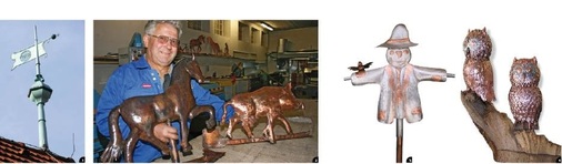 Wenn Wilhelm Buchert von seiner schweißtreibenden Arbeit spricht, kommt er ins Schwärmen. „Erst musste ich einiges lernen, bis ich das Metall so biegen und dehnen konnte, wie es für die gewünschten Figuren erforderlich war. Dann ging mir die Arbeit immer schneller von der Hand“. Die einfachste Art, den Wetterhahn aufs Blech zu bannen, besteht darin, eine angefertigte Zeichnung mit einem Kopierer zu vergrößern, diese auf das Objekt zu übertragen und dann mit der Stichsäge auszusägen.