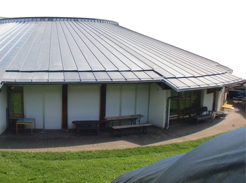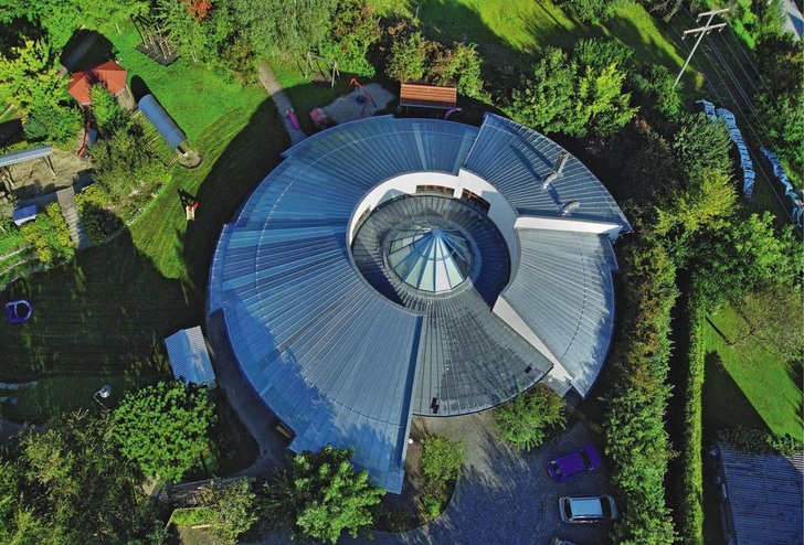 Aus der Luft gesehen erinnert das kreisrunde Titanzinkdach des Kindergarten Hengersberg (Schwarzach / Niederbayern) an eine gigantische Torte. Speziell für Klempner dürfe dieser Anblick Lust auf mehr verursachen – erst Recht, wenn diese sich detailliert mit der „Zutatenliste“ befassen. Das eingesetzte Material stammt von KME, die Maschinentechnik von Schlebach und das handwerkliche Know-how vom Fachbetrieb Pichler GmbH aus Regen-Schweinhütt. In der Vergangenheit konnte das 1933 gegründete Traditionsunternehmen schon manches Mal auf sich aufmerksam machen – beispielsweise mit der Fassadenbekleidung eines Heimatmuseums am Starnberger See.