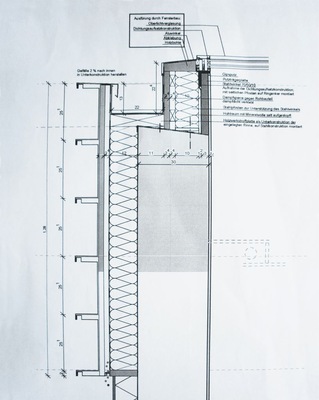 Es kam also wie es kommen musste. Gleich zu Beginn unserer Arbeiten ging schief was nur schiefgehen konnte. Die Arbeiten standen unter enormen Zeitdruck. Die ordnungslose Bauleitung drang darauf, gleichzeitig an unterschiedlichen Stellen mit der Kassettenmontage zu beginnen. Wie im beiliegenden Detail und auf den Fotos zu erkennen ist, muss die unterste Wandkassette fluchtgerecht um das gesamte Gebäude verlaufen. Aufgrund eines nicht lieferfähigen Fensterbauers konnte der Zimmermann seine Vorleistungen ebenfalls nicht fertigstellen. Das Ergebnis: Ein um 6 cm abweichendes Höhenmaß hatte zur Folge, dass bereist vorgefertigte und montierte Fassadenelemente wieder abgerissen werden mussten, woran auch die teilweise lautstarken Baustellendiskussionen wenig änderten. Nach diesem Zwischenfall intensivierten Architekt und Bauleitung die Projektbetreuung, woraufhin sich die Baustellensituation merklich verbesserte. Übrigens war der Abriss nicht einfach. Immerhin kann ich heute sicher behaupten, dass der verwendete Kleber unwahrscheinlich gut hält.