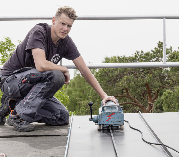 Die Spezialisten arbeiten konzentriert und es herrscht eine ruhige Atmosphäre. Tommie schneidet die langen Bahnen zu und bereitet gleichzeitig die Falze vor. Die Maschine dafür kommt aus Deutschland. „Das sind die Besten“, sagt er. Die langen, profilierten Scharen werden dann zu zweit an ihren Platz getragen und vorsichtig nebeneinandergelegt. Damit die Falze diesmal absolut dicht werden, trägt Fredrik das Falzgel „Tix transparent“ mit dem Applikator gleichmäßig auf dem Falz auf. Schwedische Klempner arbeiten seit 40 Jahren mit diesem Falzgel und haben damit sehr gute Erfahrungen gemacht, erfahre ich. Das Gel haftet auf allen Metallen und es ist frost- sowie UV-beständig. Die Verarbeitung des Gels kann entweder sofort nach dem Auftrag oder bis spätestens 48 Stunden danach erfolgen. Das Dichtmittel ist rasch aufgetragen. Jetzt haken die Männer die Falze routiniert ineinander und positionieren die Schar passgenau. „Okay?“, fragt Fredrik und sichert die Schar mit der Klammermaschine gegen Abrutschen. Dann bringt Viktor eine kleine Maschine, die liebevoll Loket (auf Deutsch: die Lok) genannt wird. Wie von Zauberhand läuft die Maschine selbstständig die Falze rauf und runter. Dabei werden die Falze mit einem speziellen Rollensatz geschlossen. Den Männern gefällt’s und ich muss zwangsläufig an meinen kleinen Bruder beim Eisenbahnspielen denken.