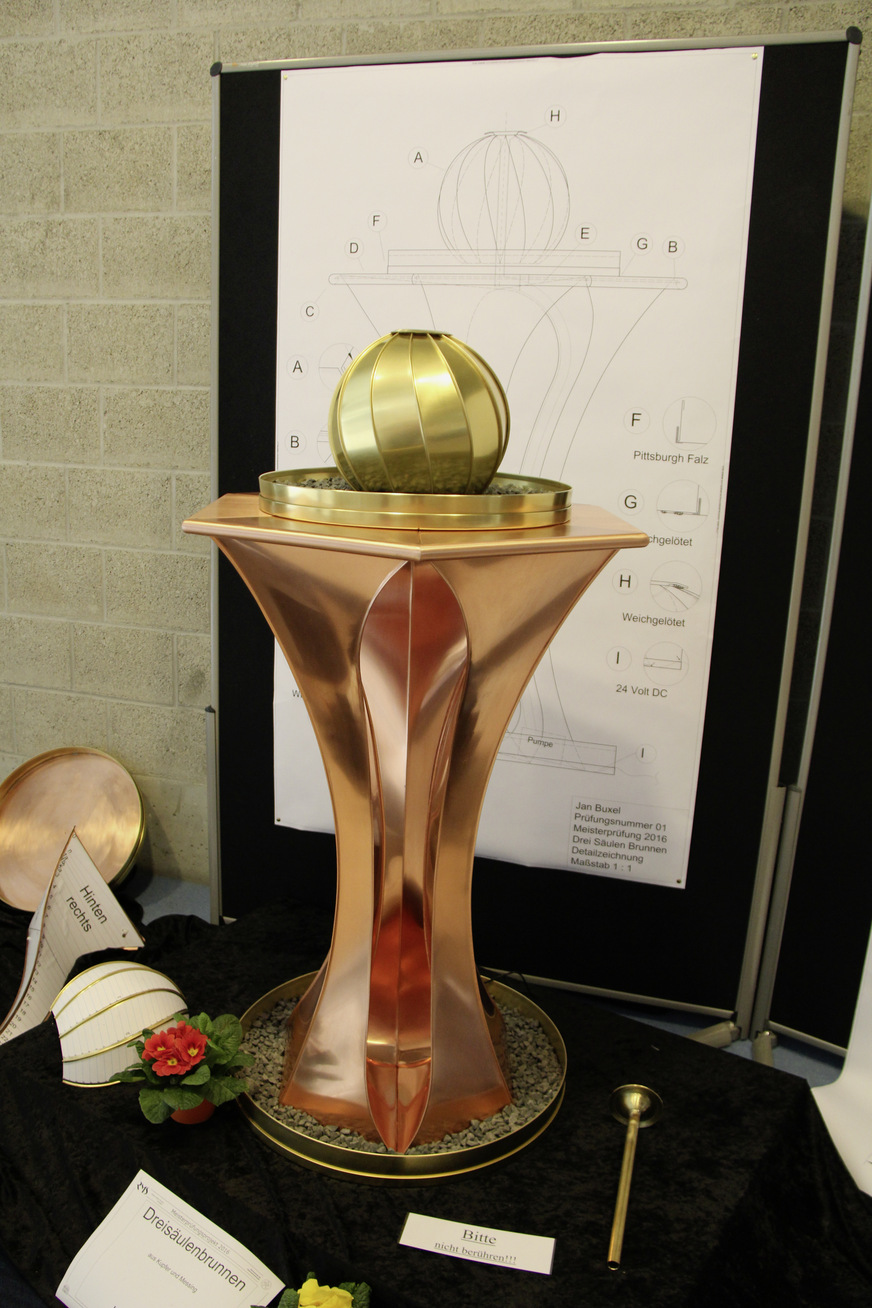 Und wie ist es heute? Klassische Meisterstücke einmal ausgenommen, überzeugt die Qualität der Meisterprüfungsobjekte seit Jahren die Fachwelt. Den entsprechenden Beweis erbringt der alle zwei Jahre stattfindende BAUMETALL-Wettbewerb Meisterstück des Jahres. Immer wieder beeindrucken dort innovative Meisterstückideen. Dennoch bilden Arbeiten wie der gefaltete Kupferkranich von So Iwamoto oder der Schirmständer von Sylvio Ahr die Ausnahme. Stattdessen werden Stehtische in zahlreichen Variationen hergestellt – knapp gefolgt von Globen unterschiedlicher Couleur. Alle Arbeiten verbindet das hohe Niveau fachlichen Könnens und die perfekte Umsetzung diverser Details. Auch Mark Holzwarth (Klempnermeister und Fachjuror) betont, dass beim Meisterstück des Jahres hervorragende Arbeiten ins Rennen gehen. „Leider ist es aber auch so, dass zahlreiche Wettbewerbsteilnehmer ihre Inspiration bei den Vorjahressiegern suchen“, sagt Juryleiter aus Stuttgart. „Vision Masterpiece könnte das ändern und neuen Ideen den Sprung auf die große Bühne der Meisterstücke ermöglichen“, betont der Fachmann.