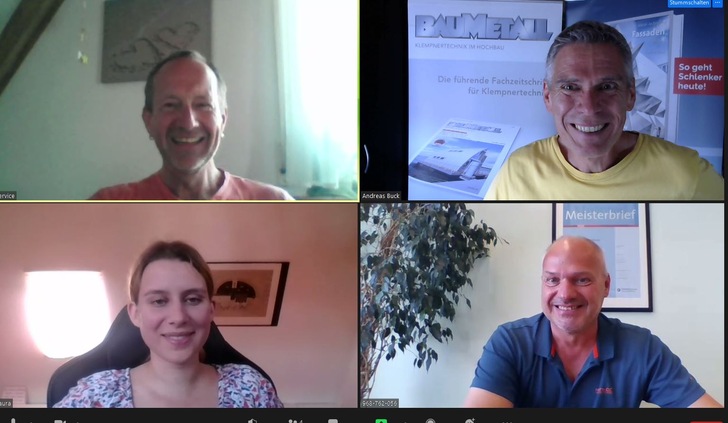 Drei plus eins oder zwei plus zwei? Das Ergebnis ist immer gleich: Diese VIER wissen wie und wo der Dachhase läuft! Arno Fell (Spenglermeister und -Ausbilder, Spengler-Meisterschule Würzburg), Matthias Kaemmer (Weiterbildungsberatung für Meisterkurse und Spengler-Intensivseminare, Spengler-Meisterschule Würzburg), Laura Kornhaaß (Klempnermeisterin, BAUMETALL-Online-Redakteurin) und Andreas Buck (Klempnermeister, BAUMNETALL-Chefredakteur) unterhielten sich online über jüngste Entwicklungen und die damit verbundene Begeisterungsfähigkeit angehender Spengler- und Klempnermeister. Laura Kornhaaß, die noch bis vor wenigen Wochen Meisterschülerin bei Arno Fell war, ist entsprechend dicht dran. Geschickt stellte sie ihre Fragen und erhielt überraschende Antworten…