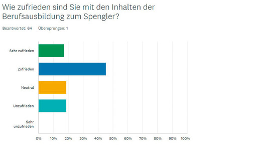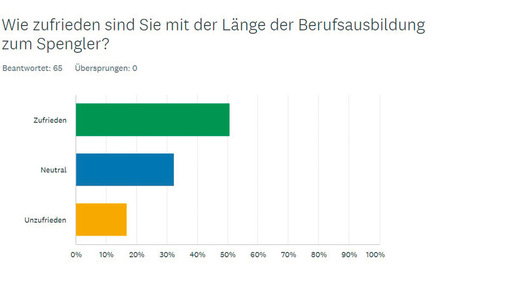 Die Umfrage zeichnet ein umfassendes Bild der Berufsausbildung zum Spengler. Aufgrund der Anzahl von 65 teilnehmenden Personen ist das Ergebnis allerdings (noch) nicht repräsentativ. Dennoch wird die Ausbildung insgesamt positiv bewertet. Das betrifft insbesondere die praktischen Aspekte. Gleichzeitig gibt es noch Verbesserungspotenzial im Bereich der Theorie-Praxis-Verknüpfung und der Ausstattung der Berufsschulen. Um die Ausbildung weiter zu optimieren, könnten folgende Maßnahmen ergriffen werden:
