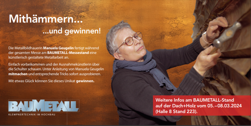Dach+Holz 2024: Wir sind dabei! Besuchen Sie uns am Zukunftsstand 223 in Halle 8 und kommen Sie mit uns ins Gespräch! Entdecken Sie unser einzigartiges Fassaden-Projekt „Libelle“ und erfahren Sie mehr über Zukunftsklempner und Zukunftsklempnerinnen. Das BAUMETALL-Team freut sich gemeinsam mit Onlineredakteurin und Klempnermeisterin Laura Kornhaaß auf den gemeinsamen Austausch mit Ihnen!