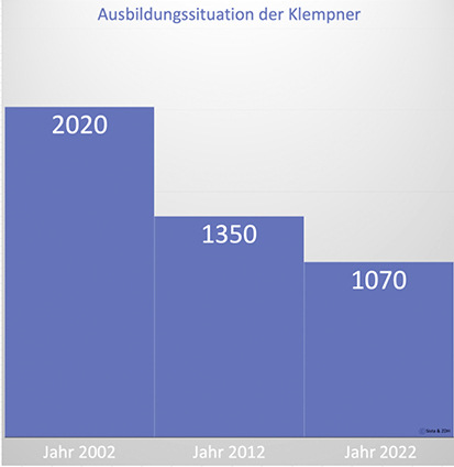 Die Anzahl auszubildender Klempner geht weiter zurück. Die Mittelwerte des Diagramms wurden aufgrund der Daten von Statista und ZDH sowie dem Bundesinstitut für Berufsbildung (BIBB) erstellt. Demnach wurden im Jahr 2022 rund 1070 gezählt. Das entspricht einem Anteil von etwa 0,09 % aller Auszubildenden in Deutschland. Der Vergleich mit den Daten aus 2002 (0,14 % aller Auszubildenden in Deutschland) zeigt: Die Anzahl auszubildender Klempner ist in den letzten 20 Jahren stark gesunken.