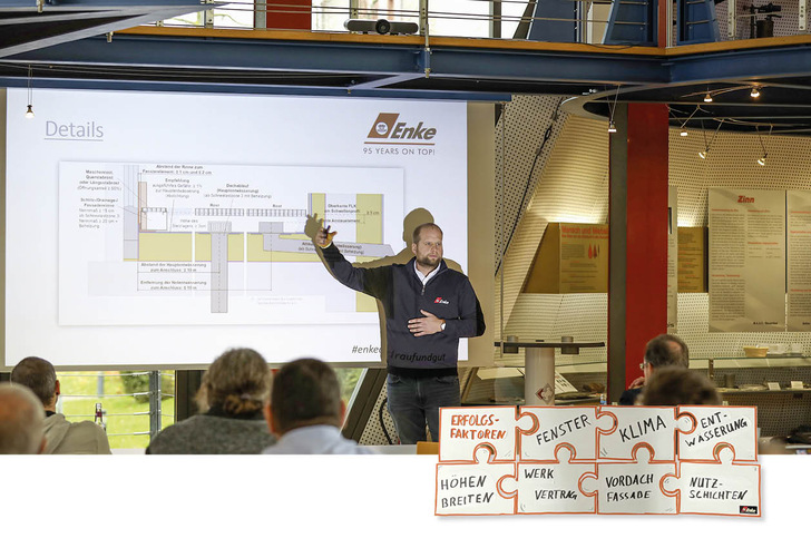 Mit ihrem Kombivortrag „Klempnermeisterausbildung im BBZ Mayen“ und „Zusatzmaßnahmen unter Metalldeckungen“ informierten Timo Eberhardt (Ausbilder am BBZ Mayen) und Thomas Sobireg (Dachdecker- und Klempnermeister, ö.b.u.v.) die Teilnehmer. Während Eberhardt ganz praktisch über Quernähte, die Ausführung eines Bündnerfalzes oder die entsprechende Wissenvermittlung samt dazugehörender Leitmotive am BBZ Mayen referierte, brachte Sobireg aktuelle Fachregel-Vorgaben zum Einsatz von Unterspannbahnen, Trennlagen oder Unterdachkonstruktionen auf den Punkt. Anschließend sprach Dachdecker- und Klempnermeister Christian Winsel (Firestone Building Products) über nachhaltige Lösungen für dichte Flachdächer und gab dabei eine Marktübersicht zu EPDM-Abdichtungssystemen.