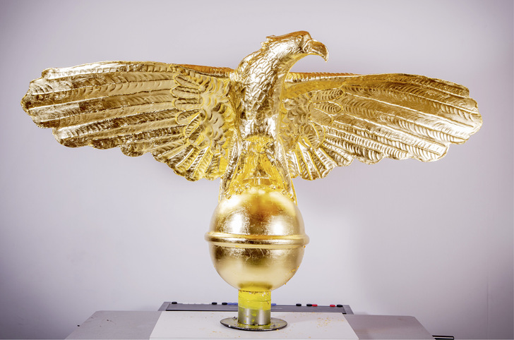 Das Original wurde in den 1980er-Jahren als Gipsguss gefertigt, anschließend mit Kupfer galvanisiert und zum Schluss vergoldet. Durch eindringendes Wasser wurde der Gipskörper im Laufe der Zeit porös. Deswegen entschieden sich die Verantwortlichen für eine neue Figur. „Wir haben den Kupferadler basierend auf historischen Vorlagen von 1920 komplett neu per Handarbeit mit Punzen und Treibhammer angefertigt“, erklärt Torsten Schneider. Dabei wurde der Vogel als freie Treibarbeit ohne Schablonen mithilfe eines Sandkissens aus Kupfer getrieben. Die so entstandenen 16 Einzelteile wurden anschließend zusammengefügt und mit 24 Karat Gold überzogen. Für die Treibarbeiten und den Korpus benötigte der Betrieb etwa 160 Stunden. Die Vergolderarbeiten beziffert Torsten Schneider mit 24 Stunden. Dabei beträgt die beeindruckende Flügelspannweite des Adlers 1,40 m. Zum Schluss brachte der imposante Vogel mit Trägergestell aus Edelstahl etwa 30 kg auf die Waage.