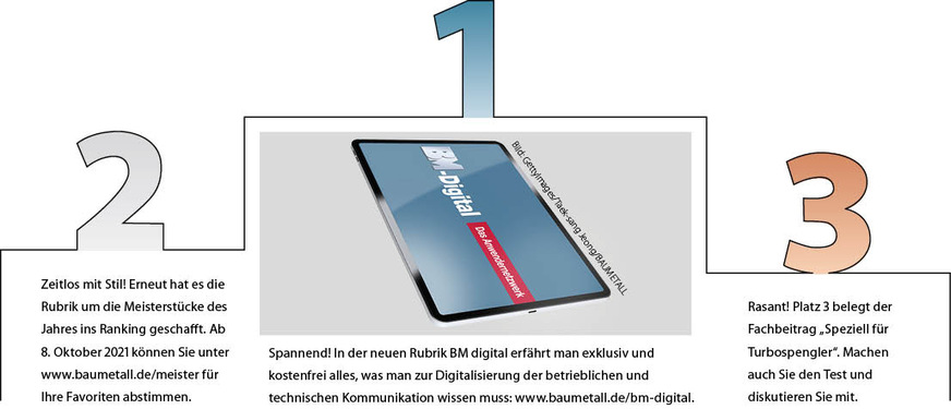 Platz 2: Diese Rubrik lässt Spenglerherzen regelmäßig höher schlagen! Auf der Themenwebseite zu den Meisterstücken des Jahres, findet man die Highlights der vergangenen Wettbewerbe. Ab 8. Oktober ist es wieder soweit! Unter www.baumetall.de/meister dürfen Sie Ihre drei Favoriten küren.
