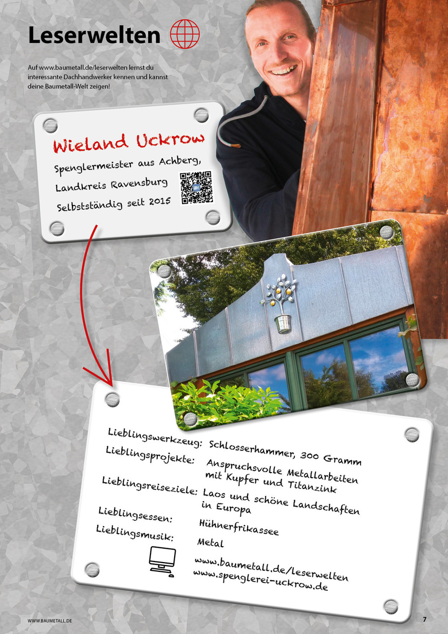 Den Anfang machte Spenglermeister Wieland Uckrow aus Achberg. Neben einem Kurzporträt in der BAUMETALL-Ausgabe 01-2025, erfährt man in der zugehörigen Online-Rubrik noch einiges mehr über den leidenschaftlichen Handwerker.