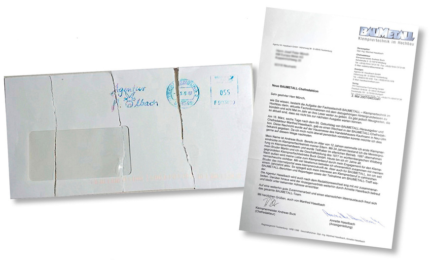 Am Nachmittag des 2. Dezember 2025 fand Baumetall-Leser Josef Peter Münch einen Brief der Agentur Haselbach in seinem Briefkasten. In gewohnter Weise trennte er das Kuvert auf, entsorgte es ohne weitere Beachtung im Altpapier und begann zu lesen. Schon nach wenigen Zeilen wunderte sich der Kupferfachmann und BAUMETALL-Autor über das Schreiben. So wurde zum Beispiel darüber informiert, dass Manfred Haselbach den wohlverdienten Ruhestand angetreten und der 41-jährige Andreas Buck in diesem Zusammenhang die Nachfolge als neuer BAUMETALL-Chefredakteur angetreten habe. Mit dem Gedanken, dass irgendetwas nicht stimmen könne, betrachtete Münch noch einmal das (zuvor leider zerrissene) Kuvert und staunte nicht schlecht: Der Brief wurde laut Poststempel am 3. Mai 2007 und mit einem Porto von 55 Cent aufgegeben. Na bravo! Auf die Post ist eben Verlass!