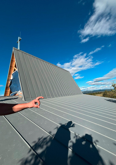 Die Holzverschalung samt Dachaufbau wurde von rumänischen Handwerkkern erstellt. Eine Besonderheit ist die tiefliegend unter Lattung und Konterlattung angebrachte Unterspannbahn. Sie schützt das Gebäude während der Bauphase und ermöglicht zugleich, das steile Dach wie auf einer großen Leiter besteigen zu können.