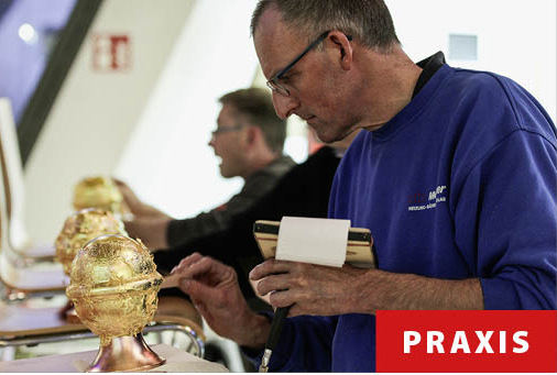 Warum glänzen vergoldete Windfahnen, Wetterhähne und Kirchturmkugeln über viele Jahrzehnte, obwohl sie extremsten Wettereinflüssen ausgesetzt sind? Diese und weitere Antworten gibt Blattgoldspezialist Christian Scheuring von der Goldschlägerei Eytzinger. Der Insider erklärt, wie und mit welchen Hilfsmitteln Blattvergoldungen vorbereitet werden und worauf es dabei ankommt. Beim Vergolden einer kleinen Übungsarbeit bekommen die Teilnehmer zunächst ein Gefühl für das sensible und wertvolle Metall. Danach werden Metallkugeln mit hauchdünnem Blattgold beschichtet. Entsprechendes Know-how vom Fachmann sowie etwas Übung vorausgesetzt, versetzt der inzwischen zum fünften Mal stattfindende Spezialworkshop die Teilnehmer in die Lage, jederzeit dauerhafte Vergoldungen auf Metalloberflächen vorzunehmen.