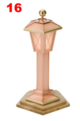 Fünfeckige StehlampeGeschwungene und lineareFalze mit GlaseinlageMaterial: Kupfer / MessingVerbindung: Falztechnik, filigrane Verstrebungen und gebürstete Messing-Wulstabschlüsse