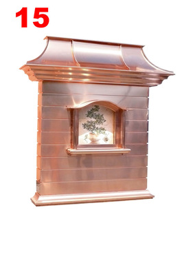 KaminhaubeTrapezförmige Front mit gedrücktem KlempnerwappenMaterial: Kupfer, EdelstahlVerbindung: Falztechnikgeprägtes Wappen