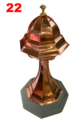 Dachspitze Achteckiger Grundkörper mit konvexem und konkavem FalzverlaufMaterial: KupferVerbindung: Falztechnik, Abschluss aus MessingPräsentation auf Steinsockel