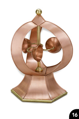 WindspielVerdrehte Stabilisatoren auf einer Kugelfläche abgewickelt, Grundkörper mit Messingprisma, kugelgelagerte WindfängerMaterial: Kupfer und MessingVerarbeitung: Falztechnik, Drahteinlage, Hammerschlagtechnik