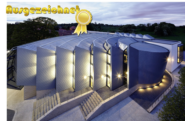 RIBA Award für Titanzink-Rauten Um die senkrechten Mauerscheiben wirken sie buchstäblich mustergültig herumgewickelt, sie unterstreichen die Kubatur des konischen Kopfbaus und interpretieren das Thema Wandverkleidung im Innern neu: Handgearbeitete Spitzrauten aus Titanzink prägen das neue Auditorium der Yarm School im Nordosten Englands. Das multifunktionale Veranstaltungsgebäude erhielt den RIBA North East Award 2013, die regional höchste Auszeichnung des renommierten Royal Institute of British Architects