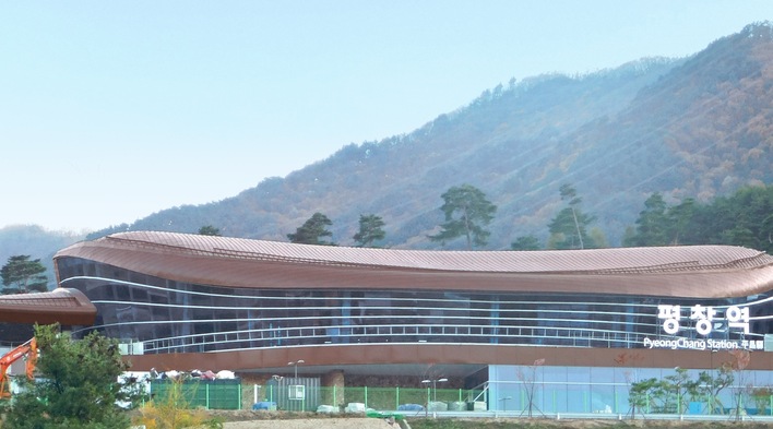 Anlässlich der Winterolympiade in Pyeongchang, Südkorea, wurde eine Bahnstrecke mitsamt neuer Bahnstation gebaut. Das Bahnhofsgebäude erhielt ein Dach aus vorbewittertem Titanzink aus der Reihe "Nuance" von NedZink.