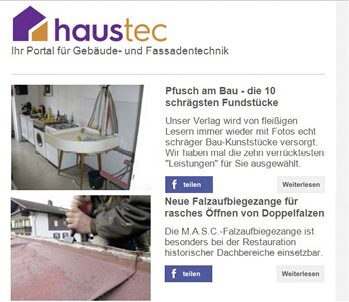 Ob Fenster und Fassade, Heizung oder Sanitär, Klimatechnik oder Photovoltaik – es gibt keinen informativeren Newsletter als den von Haustec. Speziell für Haustechnikprofis bietet das Internetportal Haustec beste Infos und das aus einer Hand. Natürlich sind auch immer wieder Informationen für...