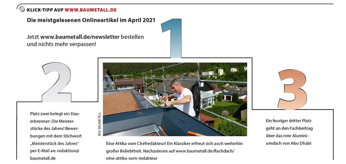 Sie haben fleißig BAUMETALL-Online gelesen und hier sind nun Ihre Favoriten. Das sind die meistgelesenen BAUMETALL-Onlineartikel aus dem Monat Juli.