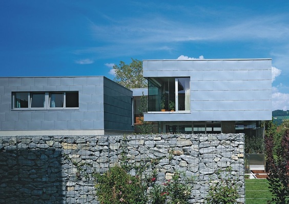 Wie ein Metallvorhang legt sich die Edelstahlhülle über den Baukörper. Fast scheint es, als hätte das Künstlerpaar Christo und Jeanne-Claude die Verhüllung des Einfamilienhauses im österreichischen Höchst inszeniert. Vom First bis zum Sockel des Gebäudes verlaufen silbergraue Metallbahnen und sogar Schornstein und Carport-Attika bestehen aus der edlen Stahllegierung. Ob über die edle Hülle dieses Wohnhauses ebenso viel diskutiert wurde wie über die des Reichstags, ist nicht bekannt. Sicher ist jedoch, dass die Edelstahlbekleidung des Vorarlberger Wohngebäudes die Haltbarkeit der Reichstagshülle bei weitem übertrifft.