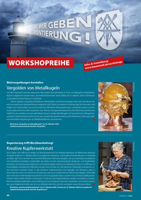 Am 1. und 2. Februar 2018 sowie vom 13. bis 16. März finden im Europäischen Klempner- und Kupferschmiedemuseum erneut verschiedene BAUMETALL-Workshops statt. Weitere Termine sind für den 13. und 14. Dezember vorgesehen. Ergänzend dazu bietet das Klempnermuseum drei speziell auf die Bedürfnisse...