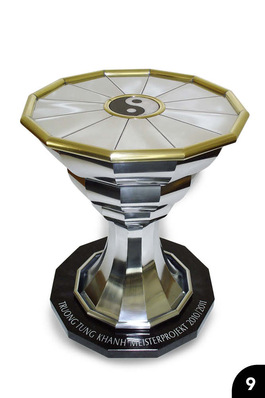 Yin und YangZwölfteilige Säule mit nach innen abgesetzten Falzverbindungen und EinlegearbeitenMaterial: Zink und MessingVerarbeitung: Wulst, Steck- und Lötverbindung