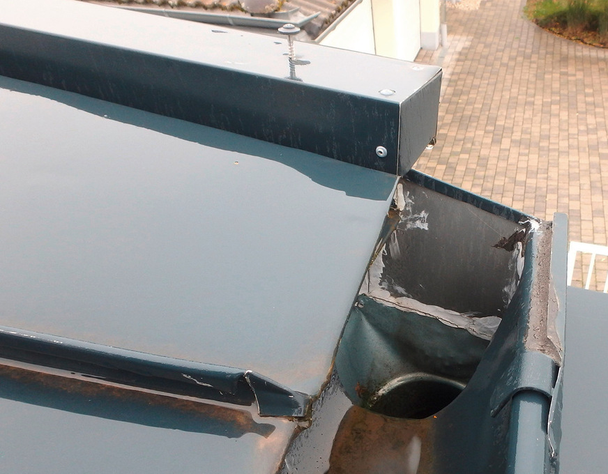 Der nächste Fehler wurde am Traufpunkt gemacht: Die Einfalzung der Dachfläche am Traufprofil erfolgte ohne den erforderlichen Abstand. Darüber hinaus war die Rückkantung komplett zugedrückt, was den Kapillareffekt und somit das unkontrollierte Einziehen von Niederschlagswasser begünstigt.