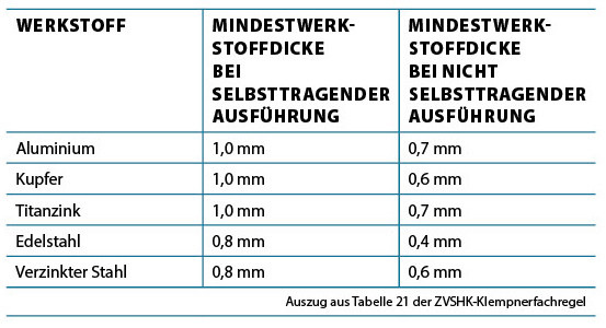 Diese Unterscheidung ist das hauptsächliche Kriterium für die Blechdicken, aus denen die Attikaprofile angefertigt werden müssen. Die Mindestwerkstoffdicken hierfür sind in nachstehender Tabelle angegeben.