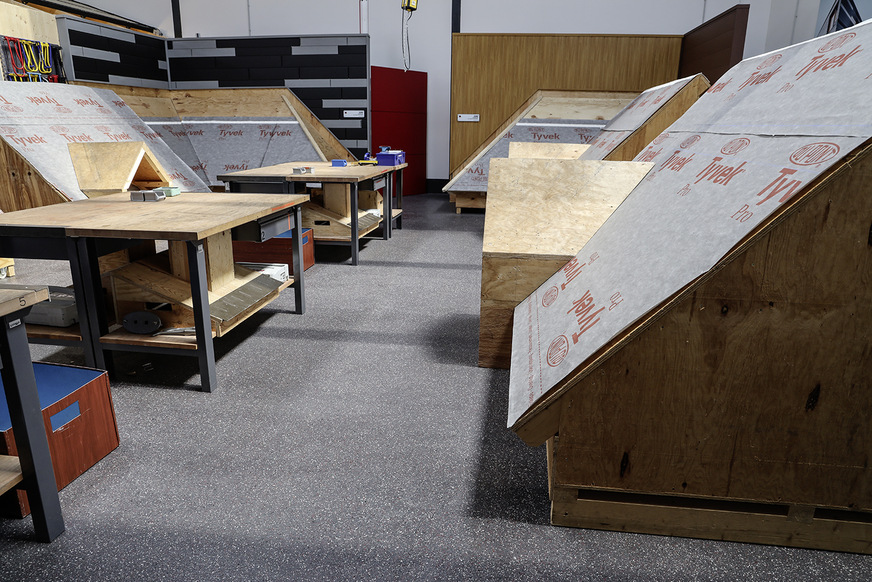Durch das Einstreuen farbiger Enke-Kunststoffchips in den Prefa-Farben erhielt das Betoncoat-System der Prefa Academy eine individuelle Note. Der Einbau des robusten Bodens erfolgte durch das Aufbringen folgender Schichten:
