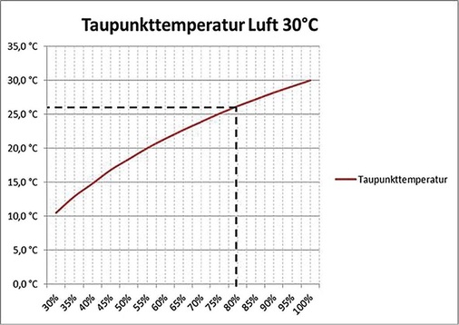 - Die Taupunkttemperatur dieser Außenluft liegt bei über 26°C (s. Grafik).
