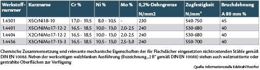 Spezialisierte Klempnerfachbetriebe bieten in der Regel Chrom-Nickel-Molybdän-Stähle an, um auch bei Unwägbarkeit bestimmter Faktoren, wie Korrosionsbeständigkeit, zu gewährleisten. NebenstehendeTabelle führt die für Flachdächer eingesetzten Edelstahlsorten auf. »