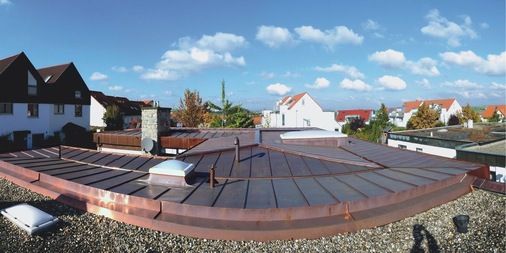 Einmal mehr stellten die Klempner (planend Michael Scheffel, ausführend Klaus Deul und Michael Gungl) des Fachbetriebes Scheffel ihre Fachkompetenz unter Beweis. Schließlich war zur Eindeckung der rund 215 m 2 großen Dachfläche die volle Bandbreite klassischer Klempner-Anschlussdetails gefordert. So wurden zahlreiche Kupferscharen an Oberlicht-, Sanitärlüfter- und Schornstein-Durchdringungen angeschlossen. Zudem war eine Anpassung der Scharen an diverse Zuleitungen, etwa zur Solaranlage, vonnöten. Ein weiteres Klempnerhighlight war die Bekleidung des abgesetzten Dachrandes mit kupfernen Kassetten. Diese wurden am Stoß jeweils 1 cm um 180° umgekantet. Die auf einer Dachrandfläche von etwa 80 m 2 angebrachten Kupferkassetten verbanden die Klempner aus Rutesheim mit leicht gewölbten Kupferschiebern (Zuschnitt 5 cm). Eine weitere Herausforderung war die Ein- und Anbindung der Kupferelemente an das teilweise glasbedeckte Terrassendach!
