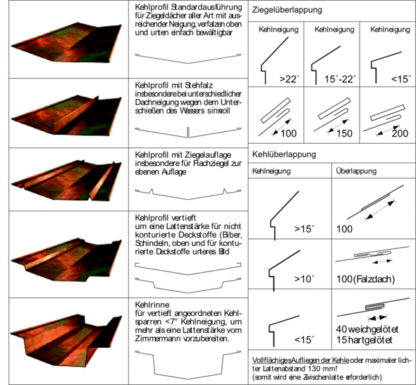 Kehlprofile verbinden zwei schräggeschnittene Dachflächen miteinander. Der Deckwerkstoff entwässert in dieses Profil. Aufgaben: Wasser sammeln und ableiten (Kehlrinne), Unterschießen des Wassers von einer Dachfläche in die andere unterbinden, Wetterschutz für den Dachaufbau und sichere Einleitung in die Rinne. Das Kehlprofil muss soweit unter die Ziegel/Betondachsteine greifen, dass einerseits die Ziegelüberdeckung gewährleistet ist, andererseits dem Deckstoff noch eine Nase zum Einhängen in die Lattung verbleibt. Teilweise muss der Deckstoff dann gedrahtet werden.