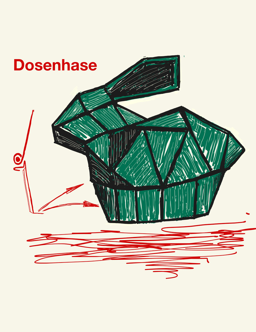 Ideal zur Aufbewahrung von Ostereiern und anderem Schnickschnack ist dieser Dosenhase. Aus Dreiecken und Trapezen zusammengesetzt, zeigt das Klempnertier, was möglich ist, wenn Klempner beherzt zu Schere und Lötkolben greifen. Besondere Extras sind die Drahteinlage am Hasendeckel sowie der an einen Traufstreifen erinnernde Abschluss des korbförmigen Unterteils.
