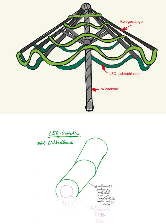 Der Aufbau besteht aus geschwungenen „Seilen“ aus in sich gedrehtem verfalztem farbigem Blech (keine Rohre) mit dimmbarer LED-Beleuchtung. Über dem gesamten Lichtschlauch „Schlange“ ist eine geschwungene Halbschale aus Metallblech mit ca. 3 cm Abstand angebracht. Diese Halbschale gibt dem LED-Licht die geschwungene Form. Die Halbschale liegt über dem LED-Licht, sodass das dimmbare Licht nach unten und mit je 45 Grad zur Seite leuchet. Für eine zusätzliche Schwierigkeitsstufe soll sich die Lichtquelle im Inneren der Halbschale spiegeln. Der Schirm mit geschwungenen „Seilen“, nach außen ragenden Schirmkonsolen aus Blech und mit dimmbarer Beleuchtung kann sicherlich Karibik-Feeling zu Hause entstehen lassen.