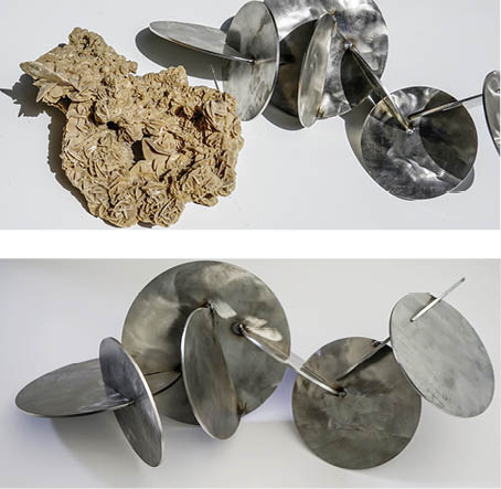 Der Mikrokosmos einer Sandrose stand Pate für den Entwurf und ein Modell zum späteren Bau einer Gross-Skulptur. Diese sollte aus voluminösen Metallscheiben bestehen. Um ein entsprechendes Volumen zu erhalten, sind sie aus mehreren Teilen zusammengesetzt. Die Dicke der Metallscheiben nimmt zur Mitte hin ab. Einzig ein Aufstellort für die aus mehreren Blechen, Bändern und Ringen zusammengesetzte Spengler-Skulptur muss noch gefunden werden.