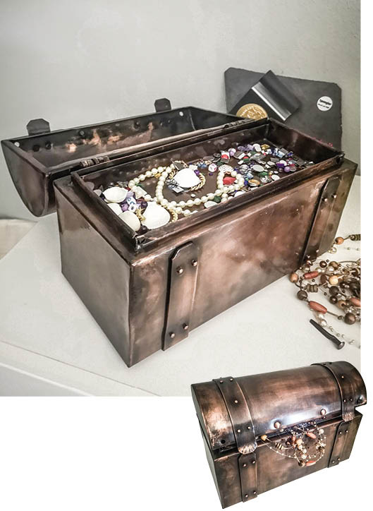 Schwer zu sagen, ob Inhalt oder die Truhe selbst wertvoller sind. Hergestellt in bester Spenglermanier zeigt dieses Kupferschmuckstück jedenfalls, was gutes Handwerk ausmacht. Scharniere, Schließen und die herausnehmbare Einlage sind ebenfalls von Hand gefertigt. Die Brünierung verleiht Eleganz.